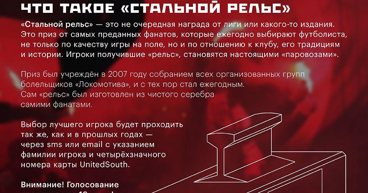 Голосование продлится до 16 июня (включительно) и по его итогам лучший игрок сезона будет награждён призом от болельщиков «Стальной рельс». Мы надеемся, что для наших ребят этот приз будет особо ценен, так как присуждается он и вручается людьми, которые отдают всё ради побед нашей команды.