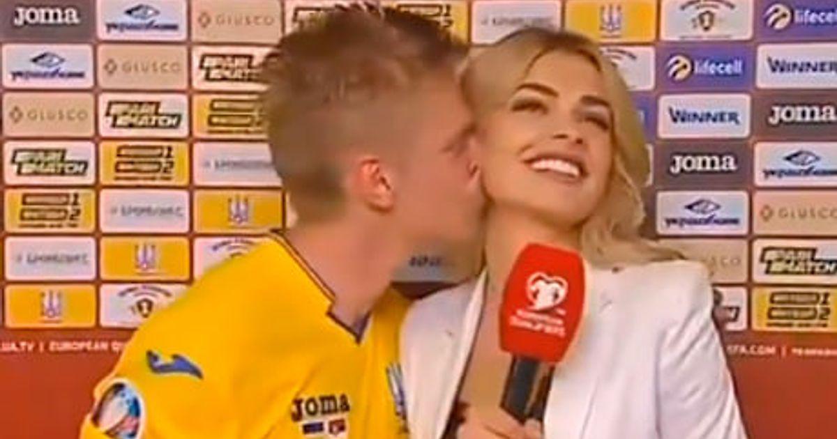 Седан попыталась спросить у молодого футболиста о предстоящей игре квалификации Евро-2020 против Люксембурга. Зинченко вместо ответа страстно поцеловал девушку в щеку и с довольным видом отправился праздновать победу. Репортер засмущалась и передала слово в студию, которая явно оживилась после действий Александра.