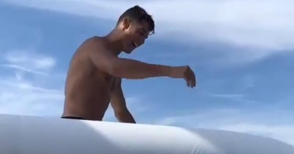 Криштиану спускается с надувной горки на отдыхе в Греции
