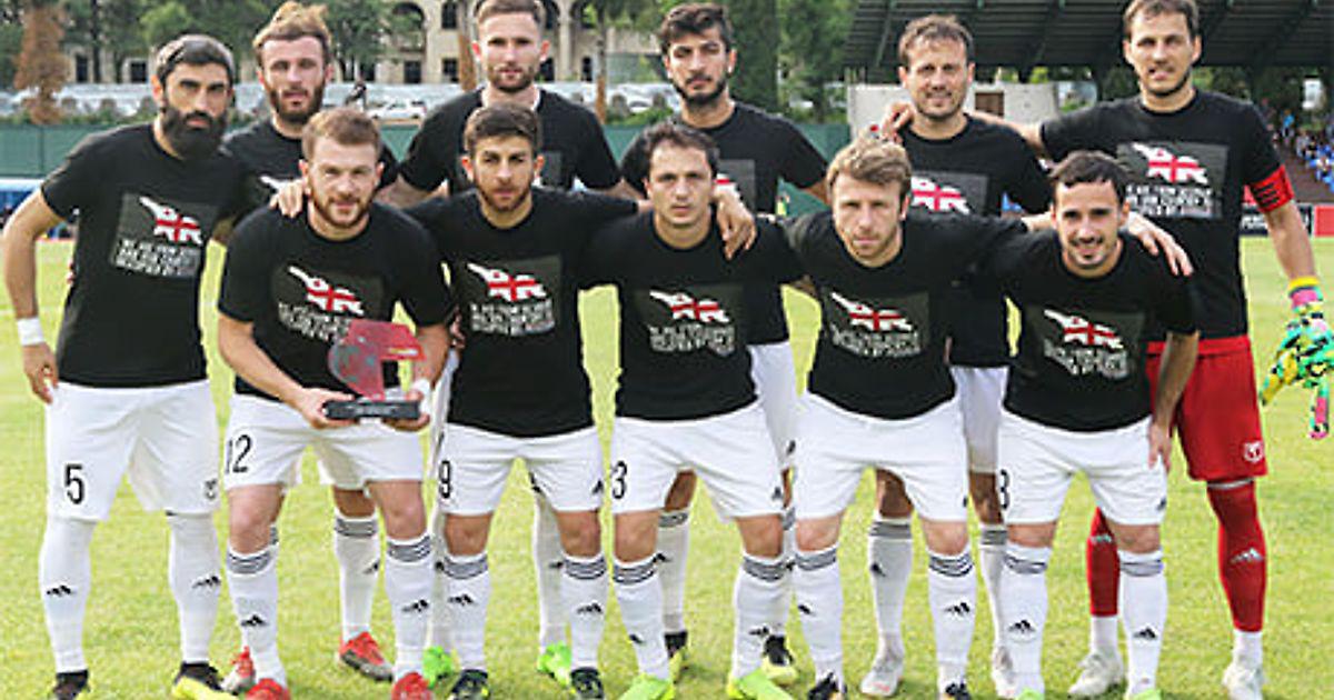 Так игроки «Торпедо» из Кутаиси появились на поле в черных майках с надписями, утверждающими, что Россия оккупировала часть территории Грузии.
