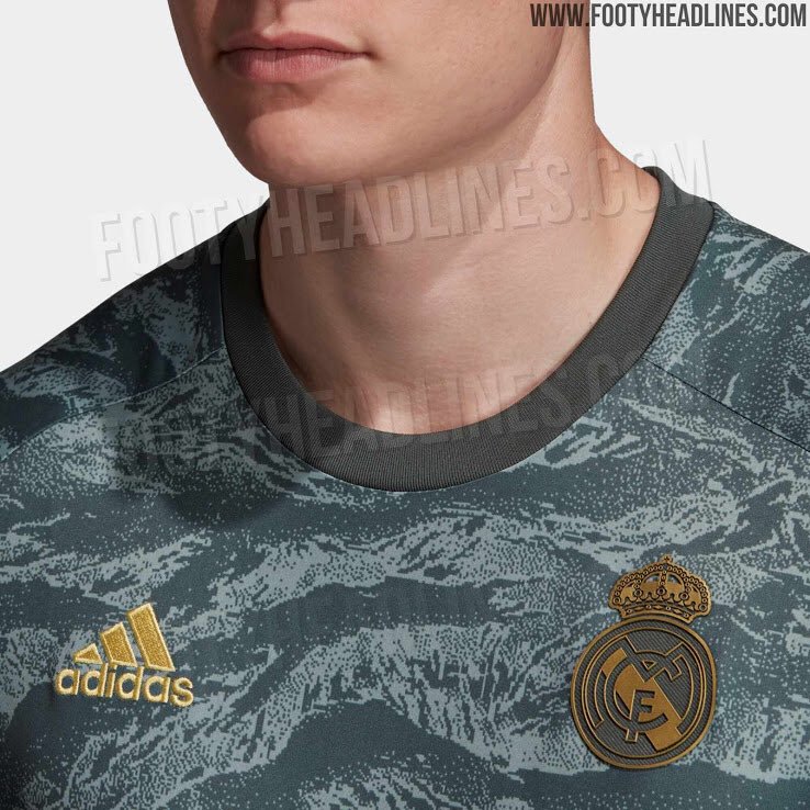 Комплект выполнен в необычном сине-зеленом цвете с разводами, похожими на полосы. Эмблема клуба и спонсоров будут золотыми (как и на основной форме игроков «Реала» в новом сезоне). Дополнен дизайн черными и серыми элементами (полосы на боках и воротник футболки).