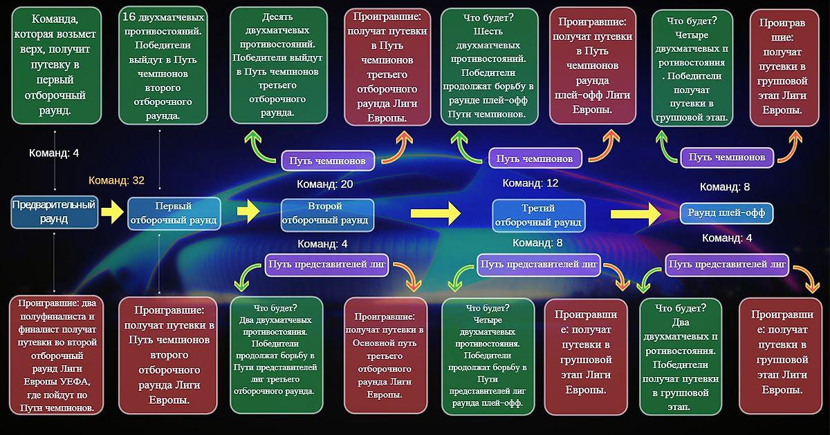 Я думаю, что у многих возникают трудности в понимании того, каким образом команды попадают в групповой этап Лиги Чемпионов. Для своего понимания и для публики Спортса я сообразил такую картинку.