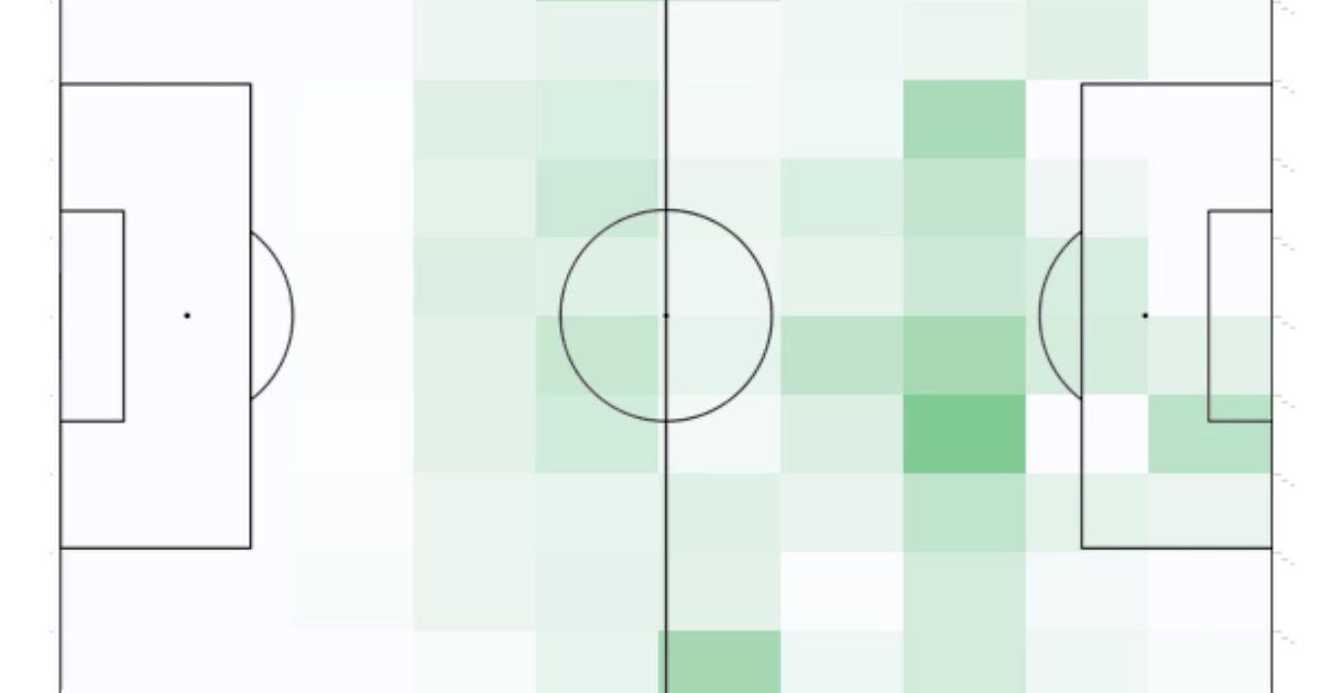 Конечная точка его передач снова-таки четко сдвигается левее центра поля, но глубоко в штрафную площадь соперника. В своем выборе он строго следует поиску коридоров для передач ближе к левому краю и относительно редко пытается найти эти коридоры на правом краю атаки своей команды.