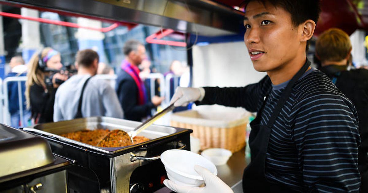 • Восточная парочка Ахметова и Нисимуры работала в кафе «У Ильзата»: игроки накладывали в одноразовые тарелки плов, посыпали зеленью, давали одноразовые приборы и желали приятного аппетита. Дальше болельщики сами наливали себе чай и раскладывали обед под зонтиками за столами для пикника.
