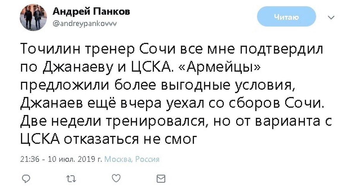 Главный тренер «Сочи» Александр Точилин прокомментировал ситуацию с будущим голкипера Сослана Джанаева, который находился в расположении его команды. «Мы собирались предложить контракт Джанаеву. Но ЦСКА предложил Сослану более выгодное соглашение. Получается, что мы больше на него не претендуем. Он был у нас две недели в расположении команды, тренировался. Но неожиданно у него появился такой вариант. Он подошёл, всё объяснил. Мы пошли ему на встречу. 9 июля он покинул расположение «Сочи». Но у нас сейчас закрыта позиция голкипера, новый вариант искать не планируем», — сказал Точилин в беседе с корреспондент