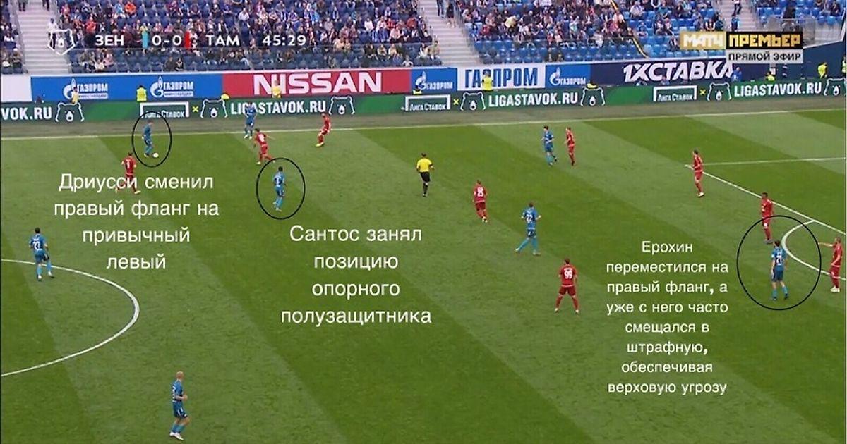 Зенит кардинально перестроился во втором тайме. Сантос оказался в опорной зоне, Жирков опустился на позицию левого защитника, Ерохин переместился на правый фланг, а Дриусси - на левый:
