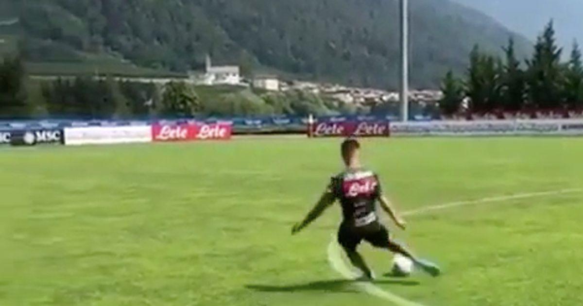 Итальянский футболист, капитан клуба Наполи Лоренцо Инсинье крутым ударом попал прямо в перекладину во время тренировки.