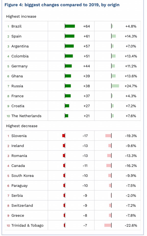 По сравнению с 2018 годом наибольшие изменения в абсолютном выражении были зафиксированы у бразильцев, испанцев и аргентинцев. В относительном выражении, среди этих трех стран, наиболее заметный рост наблюдался в Испании (+14.3%). Качественные выступления сборной Колумбии, России и Хорватии на Чемпионате мира 2018 года, вероятно, позволили игрокам из этих стран повысить свою привлекательность за рубежом.