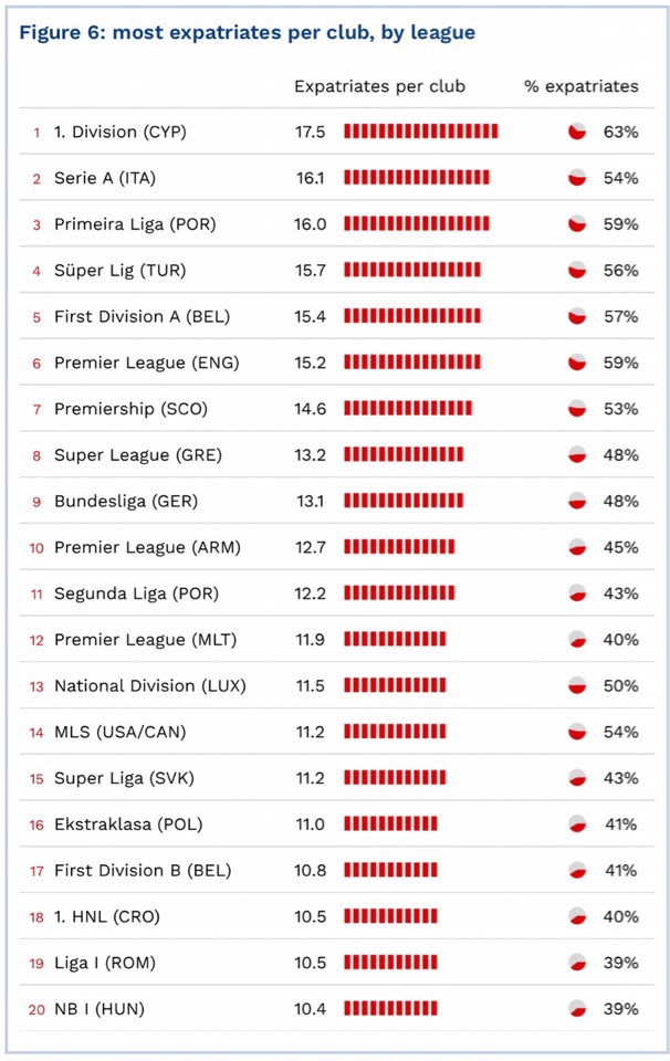 В относительном выражении самое сильное присутствие эмигрантов по клубам и Лиге было зафиксировано в кипрском высшем дивизионе со средним показателем 17,5 экспатриантов на команду. Высшая лига футбола в США и Канаде является единственным неевропейским соревнованием в первой двадцатке этого рейтинга. Что касается Бельгии, то это единственная страна, которая представлена двумя лигами: Первый Дивизион А и первый дивизион В.