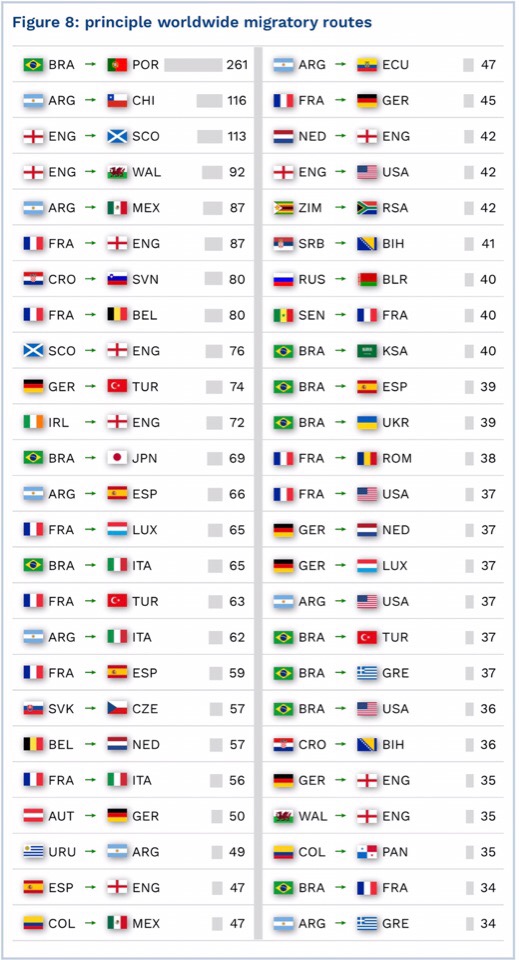 Наиболее часто используемый миграционный маршрут берет свое начало из Бразилии и заканчивается в Португалии (261 игрок). Вторым по численности является маршрут аргентинцев в Чили (116 игроков). В двух миграционных каналах, уходящих из Англии, также участвуют многие футболисты: первый заканчивается в Шотландии (113 игроков), а второй ведет в Уэльс (92 игрока).