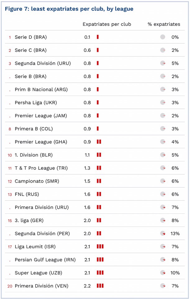Южноамериканские чемпионаты больше всего представлены среди тех, чьи клубы нанимают, в среднем, наименьшее количество игроков, импортируемых из-за рубежа. Почти нет иностранцев в бразильской Серии B и C. только шесть чемпионатов стран-членов УЕФА цифра в первой двадцатке рейтинга.