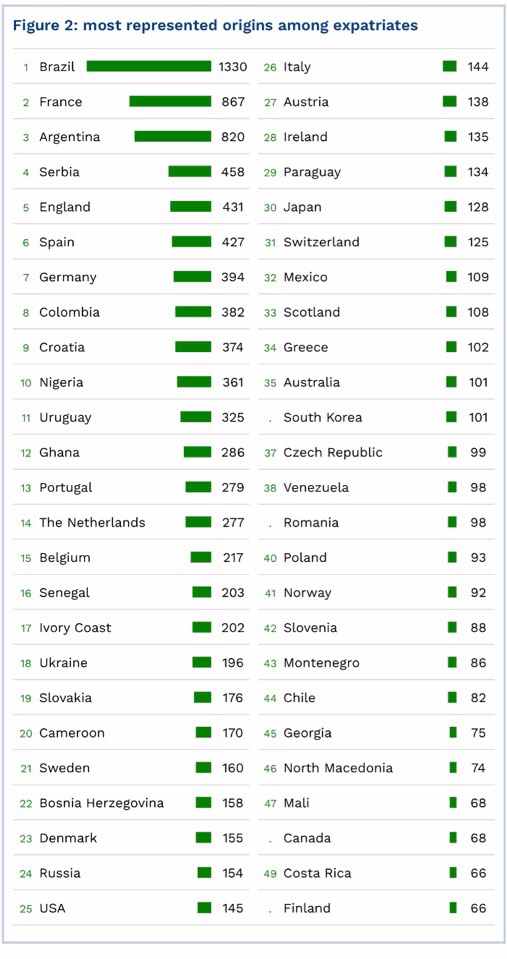 Бразилия явно находится на вершине рейтинга стран-экспортеров футболистов. В общей сложности 1330 игроков, выросших в Бразилии, играют в 147 лигах, охваченных этим отчетом. Бразильцы присутствуют в 85 ассоциациях из 98. Это отражает уникальную роль Бразилии в поставках профессиональных футболистов по всему миру.