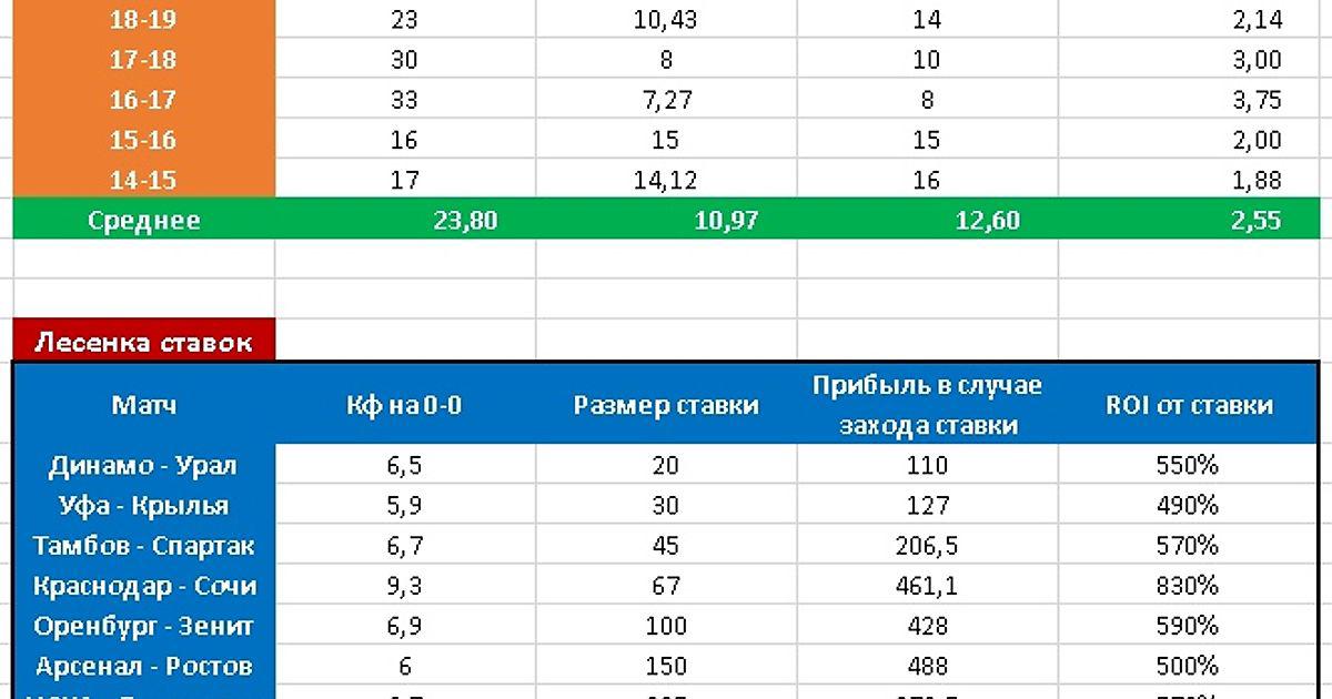 Составил табличку, с текущими коэфициентами и суммами ставок на каждый матч. Данная лесенка закроется сразу после счета 0-0. Так же указал общую прибыль по каждому их исходов.