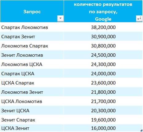 Интересно, но факт, что при поиске в google от место расположения названия команды, различается количество выдаваемых результатов, и даже здесь Спартак в ТОП-3: