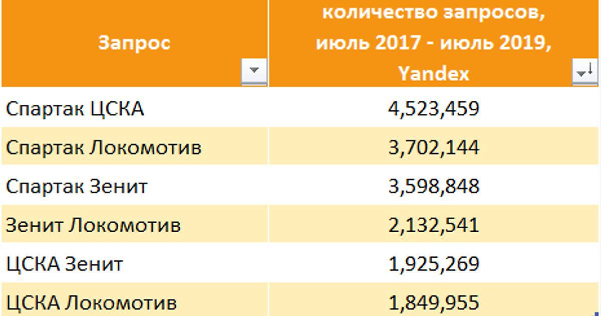Согласно Яндекс-поиску в период с июля 2017 по июль 2019 самый популярный запрос был о матче между Спартаком и ЦСКА (аккумулятивные данные за период):