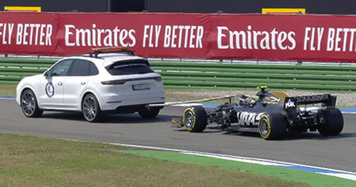 К примеру, в первой практике Гран-при Германии у пилота «Хааса» Кевина Магнуссена накрылась силовая установка — датчанин остановился посреди трека, а сессию прервали красными флагами. В результате к черному болиду подкатил «Порше», который просто взял машину «Ф-1» на буксир — и потащил в боксы.