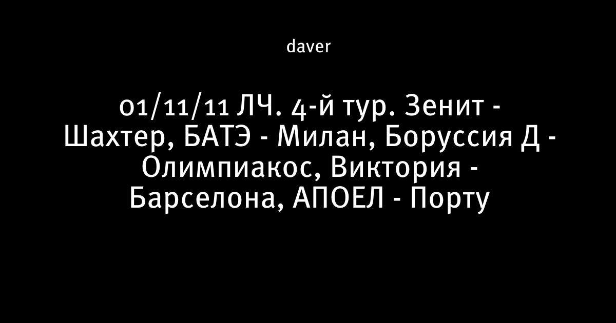 01/11/11 ЛЧ. 4-й тур. Зенит - Шахтер, БАТЭ - Милан, Боруссия Д - Олимпиакос, Виктория - Барселона, АПОЕЛ - Порту