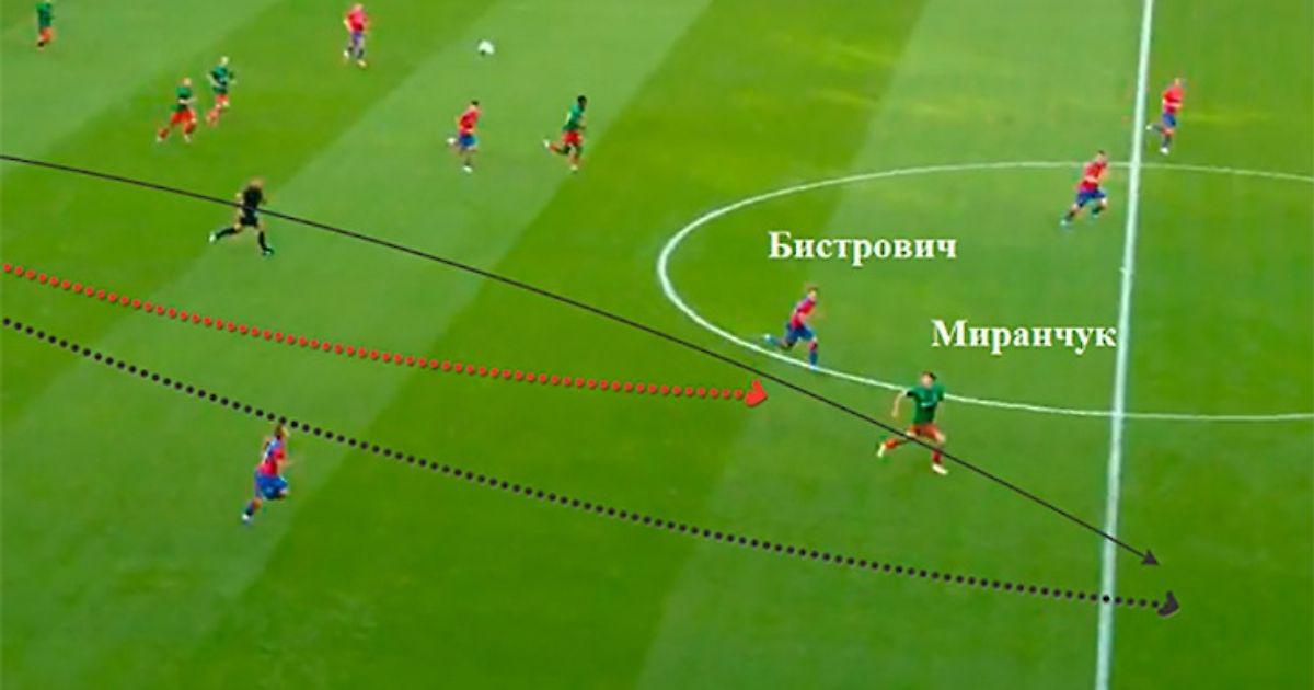 Передачи в полуфланг мимо Влашича, на Жемалетдинова, могли проходить, но его неплохо накрывал Дивеев, плюс ЦСКА быстро отскакивал назад в таких случаях – Влашич, Ахметов и Фернандес могли помочь партнеру в такой ситуации. Доставить же Миранчуку мяч из такой позиции было крайне тяжело, так как Бистрович старался ещё и перекрывать линию передач на Алексея, садясь ниже; более того, Миранчука без мяча контролировали одновременно и Магнуссон, и Обляков.