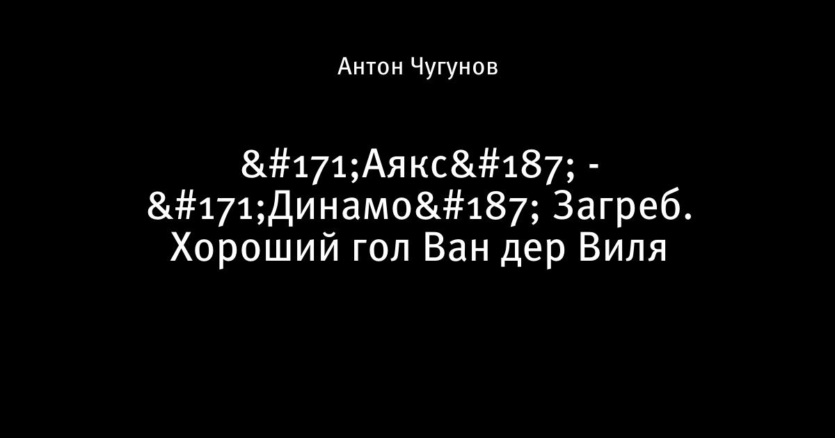 3 ноября 2011, 00:59 «Аякс» - «Динамо» Загреб. Хороший гол Ван дер Виля Автор Антон Чугунов Этот пост опубликован в блоге на Трибуне Sports.ru. Присоединяйтесь к крупнейшему сообществу спортивных болельщиков! Другие посты блога Телевизор 3.0 видео Грегори ван дер Виль Лига чемпионов УЕФА Динамо Загреб Аякс
