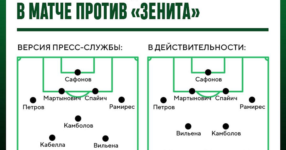 На прошлой неделе блогер Sports.ru Игорь Трофимов раскритиковал пресс-службу «Краснодара» за публикацию правильной схемы за час до матча. Клуб ответил мгновенно – уже перед игрой с «Зенитом» показали неправильную расстановку.