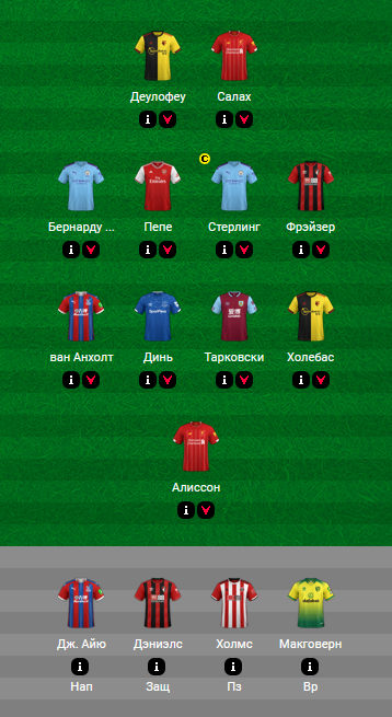 Нападение. Самыми дорогими вариантами в атаку стали Мохамед Салах 9.5 и Серхио Агуэро 9.5. Оба игрока обладают прекрасным голевым чутьём и результативностью, но иметь в своей команде обоих, большая роскошь. Агуэро скорее всего не выйдет в старте на первый матч, а вот Салах исправно забивает в домашних матчах, поэтому выбор очевиден.