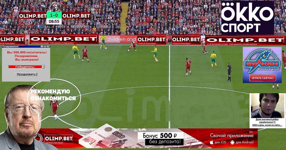 Лично я довольно терпимо отношусь к рекламе на трансляции. Когда её совсем немного, то меня не смущает плашка с коэффициентами от БК. Однако озвучивание коэффициентов от комментатора – другой вопрос. Рекламный ролик на гимне Ливерпуля – классная шутка, спасибо.