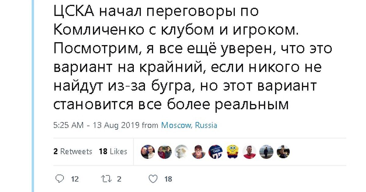 Как сообщает журналист Андрей Панков: «ЦСКА начал переговоры по Комличенко с клубом и игроком.