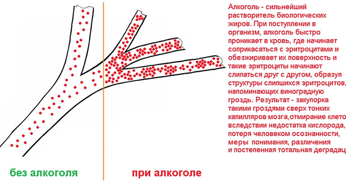И человек реально, через пару часов с момента употребления алкоголя, в туалете, в буквальном смысле этого слова, мочится своими мозгами, сопровождаемое гибелью сверхтонких капилляров мозга и определённых нейронов, что в свою очередь ведёт к потере человеком высокой меры понимания, осознанности, различения и абсурдной деградации.