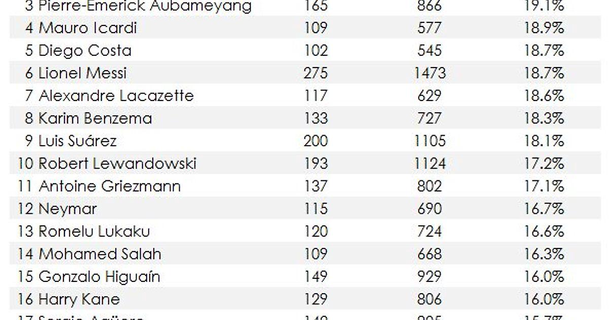Чьи удары чаще других превращаются в голы в Топ-5 лиг Европы и еврокубковых матчах за последние 7 лет? Француз Виссам Бен Йеддер возглавляет список.