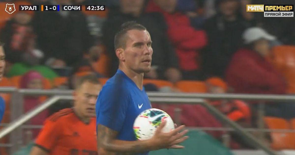 Неделю назад Антон Заболотный дебютировал за «Сочи» в матче с «Оренбургом» и отдал голевой пас. А сегодня забил! Форвард вколотил мяч с метра в пустые ворота в игре против «Урала».