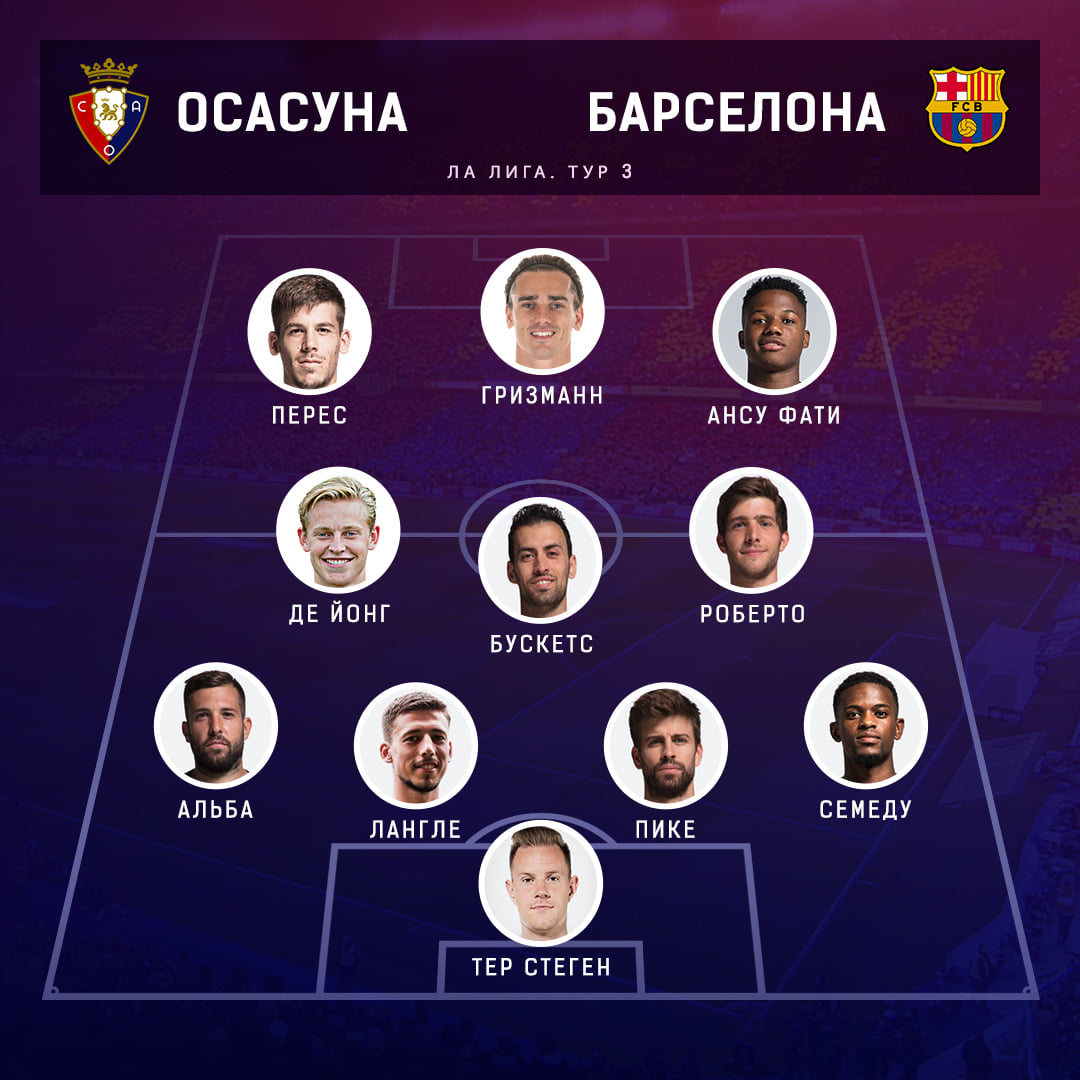 Зная консервативность главного тренера «Барсы» мы, вероятно, увидим тот же состав, что и в матче с «Бетисом». Но остается надежда, что вдохновляющий дебют Ансу Фати подарит ему сегодня место в старте. Во-первых, 16-летний талант сыграл действительно хорошо, хоть и совсем немного. А, во-вторых, «Осасуна» — гораздо менее грозный соперник, чем «Бетис» и если не давать молодежи шанс в таких играх, то когда давать вообще?