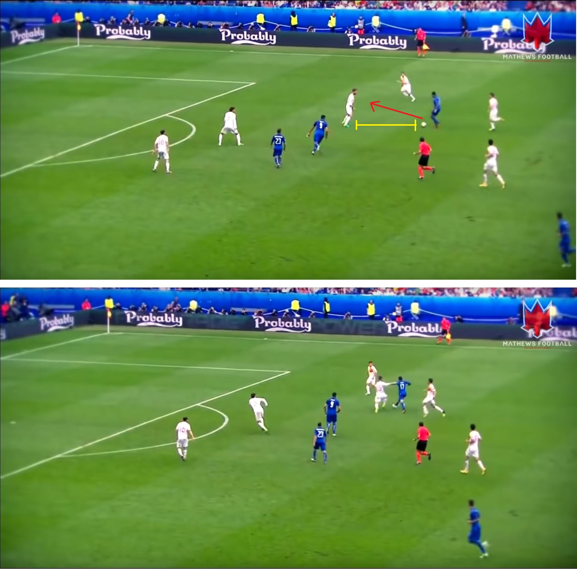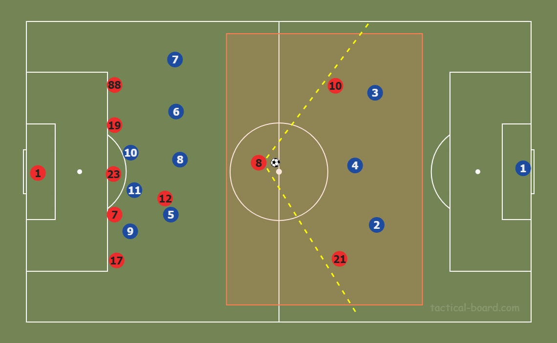Рассмотрим такую ситуацию. Соперник передвигается с мячом у него есть время и пространство для того, чтобы оценить ситуацию на поле( желтый пунктир). Его голова поднята и он видит расположения своих партнеров на поле, а также защитников.