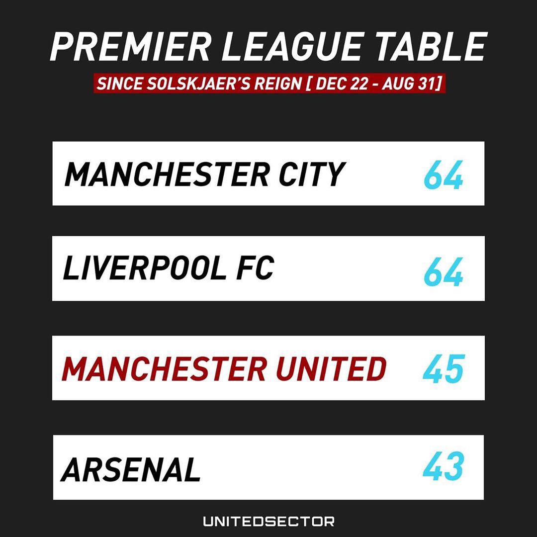 Так выглядит таблица с момента начала работы Оле-Гуннара Сульшера в качестве тренера «Манчестер Юнайтед». Видимо, тот самый резкий и удачный старт (8 побед в 8 матчах АПЛ) и повлиял на такую статистику: