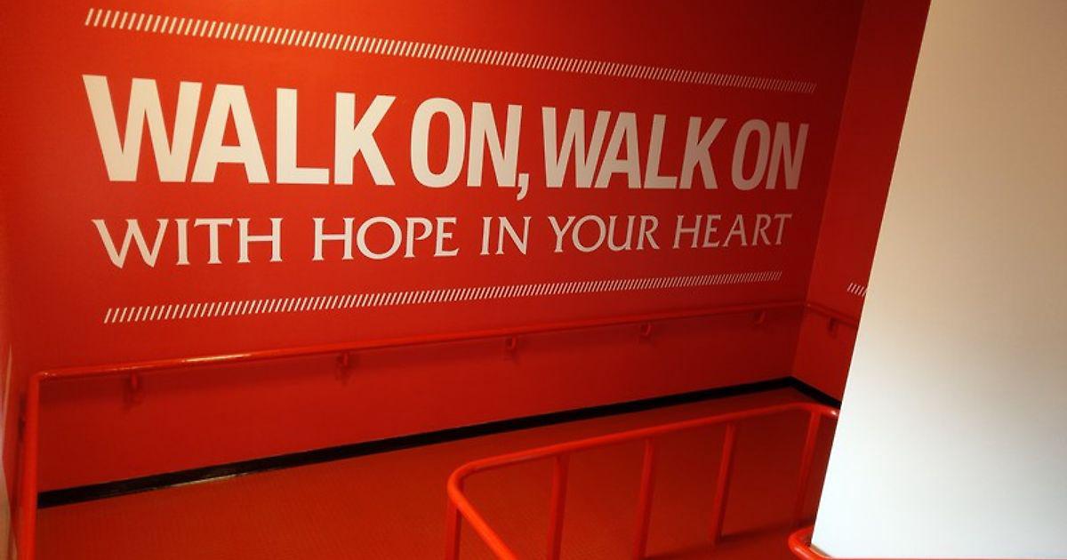 Домики настолько монохромные, что громадный стадион возникает перед вами совершенно внезапно: Бац и прямо под носом появляются столь же кирпичные ворота с культовым «You`ll never walk alone» на верхушке.