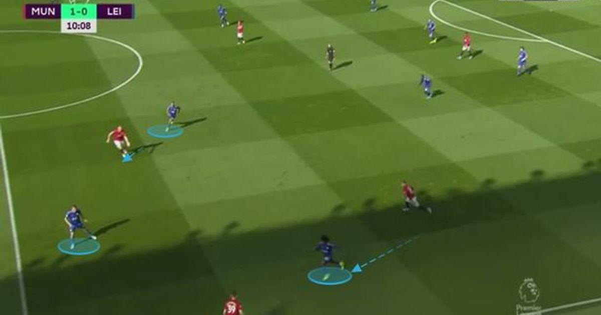 Интересно, что при этом точность его передач несколько снизилась. С 86% до 76%, но это, вероятно, явилось следствием того, что Скотт играл больше вперёд, ища варианты на обострение. При этом все 5 попыток совершения лонгболлов, которые игрок предпринял в этом сезоне, оказались удачными. Его способность точно отдать длинную передачу оказала достаточно сильное влияние на преодоление организованной обороны "Лестера", а самое главное - прессинга, который "лисы" очень умело применяют в этом сезоне. Пример этого можно видеть на скриншотах. Мактоминей получает мяч на правой бровке, сразу же оказываясь под давлением футболистов "Лестера", которые перекрывают возможные варианты передач. Мактоминея это не смущает. Он умело использует дриблинг, выигрывая для себя пространство, а затем делает отличную длинную передачу на Джеймса, который принимает удобный для себя мяч и далее создаёт угрозу у ворот "лис".