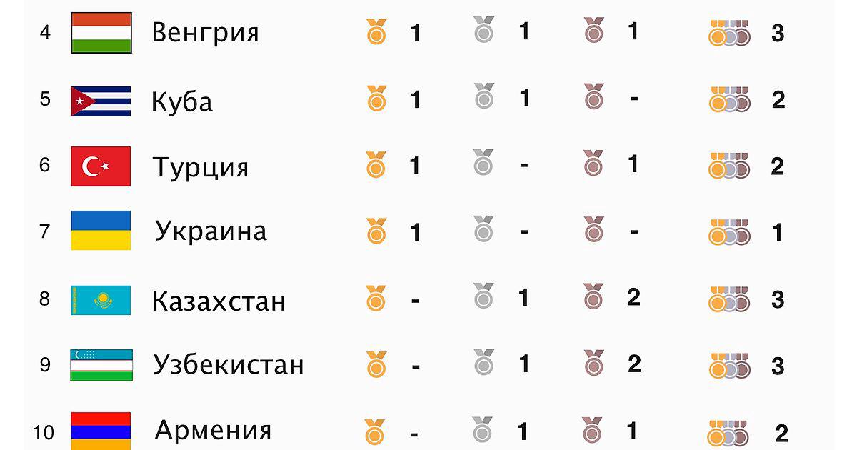 На инфографике вы можете увидеть полный медальный расклад на турнире.