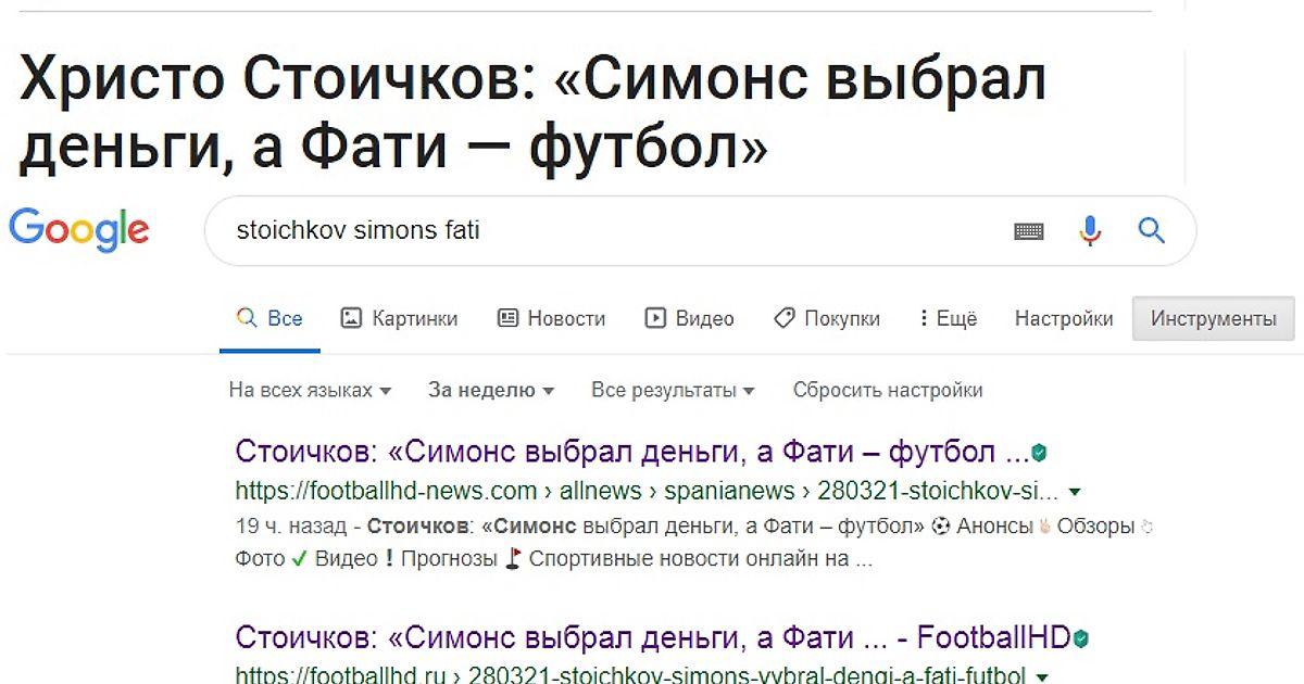 Блог свидетелей порядочности Бартомеу и Вальверде выдал перепечатку «интервью Стоичкова» с сайта footballhd.ru. Проблема в том, что это «интервью» не существует в природе больше ни на одном сайте, Стоичков никогда не говорил о Фати и Симонсе (как минимум, в одном высказывании этого не было), что можно понять после 2-3 минут поиска в Гугле и Твиттере. Но ведь целью было вылить помои на «алчного» Симонса и восхититься Фати, который и в 20 лет может остаться в «Барсе Б», потому здесь не на что смотреть.