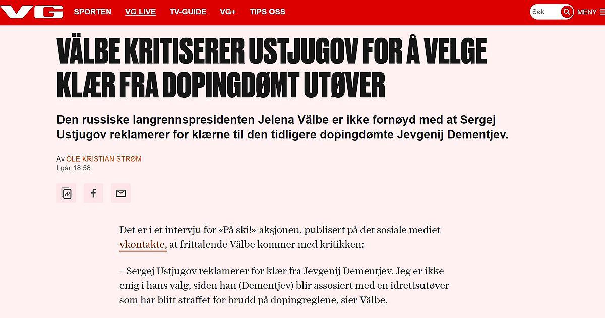 Нет, ничего ужасного не произошло – просто норвежские СМИ добрались до интервью Елены Вяльбе проекту «На лыжи». Из всего текста выдернули фрагмент, где Елена Валерьевна критикует Сергея Устюгова за продвижение бренда Евгения Дементьева, который имел проблемы с допингом.