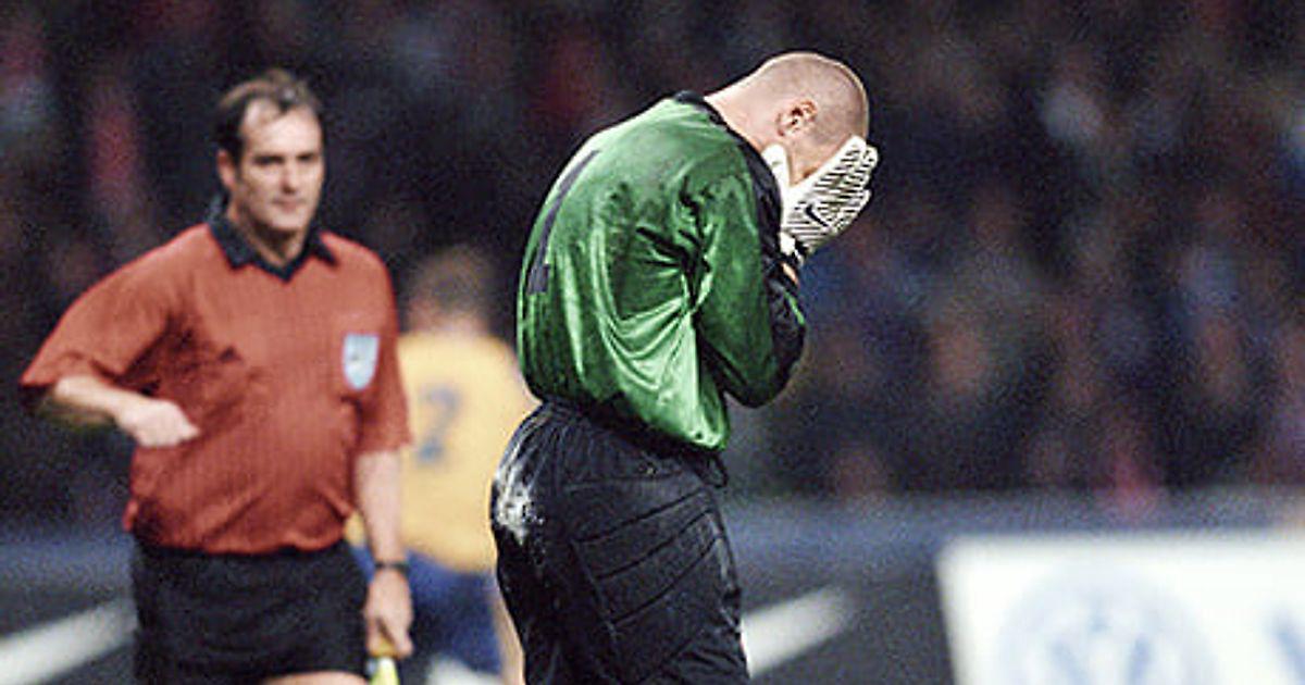 Вратарь Российской сборной Александр Филимонов (справа) переживает после ошибки, допущенной в матче между сборными России и Украины.