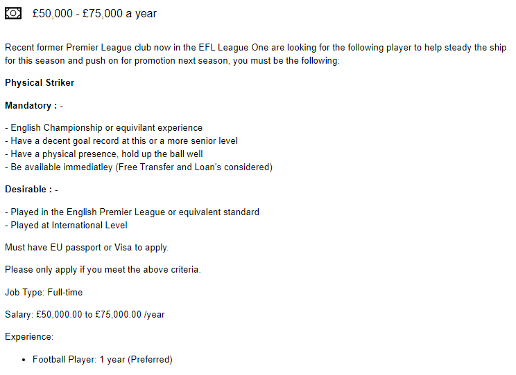 И для того, и для другого нужны скауты или связи с агентами – откуда-то ведь нужно брать данные об игроках. Клуб из Лиги 1 пошел по другому пути. На сайте поиска работы Indeed он ищет мощного форварда.
