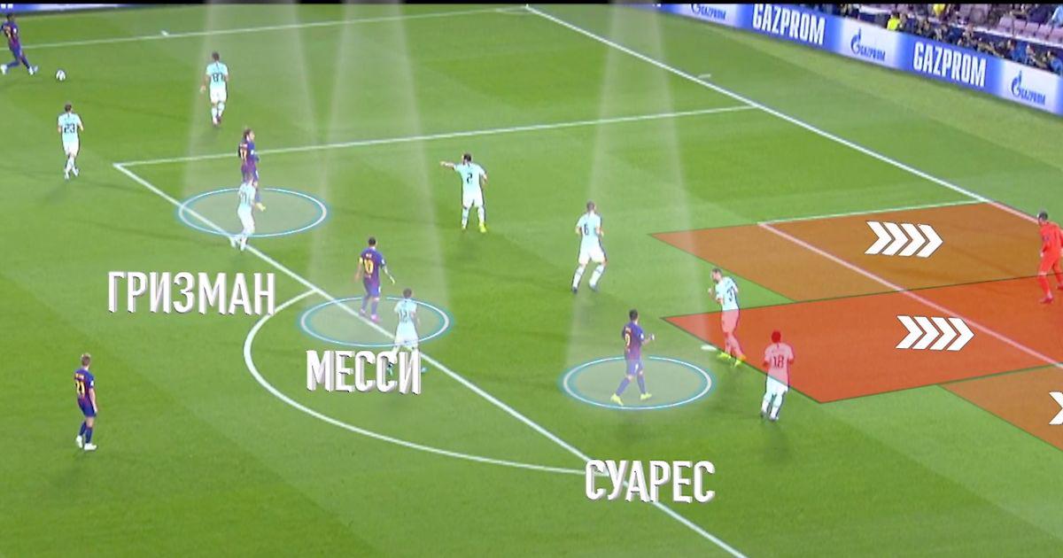 Из 12 передач под удар 9 шли поперек или назад. Голы, которые «Барса» в итоге забила, были скорее проявлениями таланта и упорства Месси и Суареса, нежели тренерской работы. Даже Видаль, которого выпустили именно добавить количественного присутствия в штрафной соперника, не смог кардинально изменить ситуацию в фазе завершения. В этом плане выделялся Гризманн, который во всех командах ценится за умное движение и ощущение пространства. Кстати, именно его ударом закончился единственный момент, где команда практически идеально атаковала пространство при навесе.