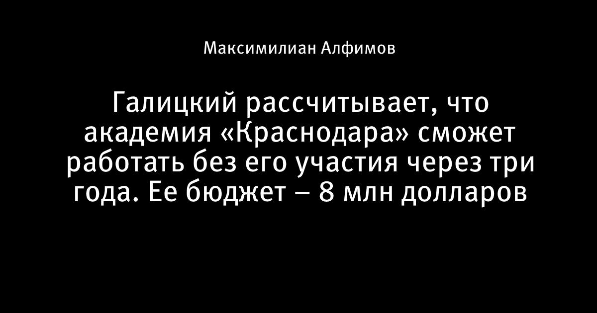 Галицкий рассчитывает, что академия «Краснодара» сможет работать без его участия через три года. Ее бюджет – 8 млн долларов