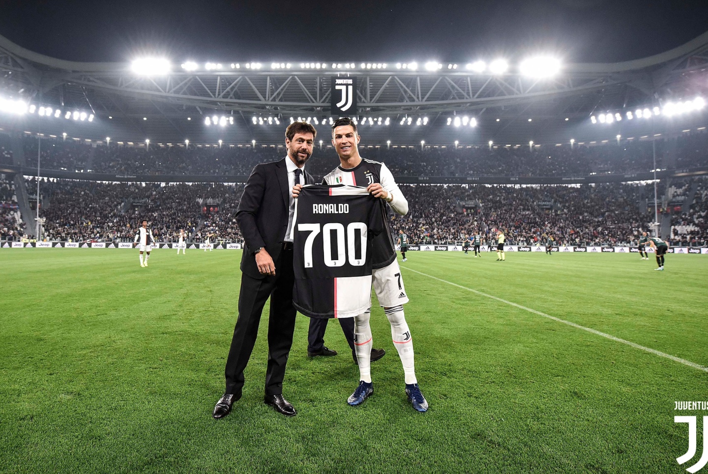Нападающий «Ювентуса» Криштиану Роналду перед матчем восьмого тура чемпионата Италии против «Болоньи» получил специальный приз — футболку с номером 700.