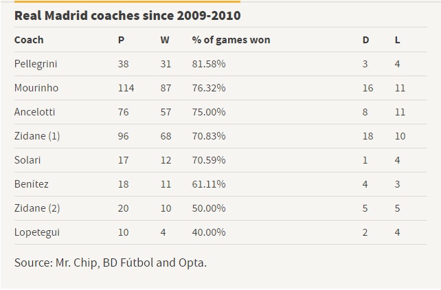 Сразу после Анчелотти на пост главного тренера пришел его бывший ассистент Зидан, который во время первого срока одержал победу в 70,83% матчей Ла Лиги (68 из 96). После него – Солари, чья команда одержала 12 побед в 17 играх в турнире (70,59%). И, если оглянуться немного назад, Хуанде Рамос продемонстрировал те же показатели, что и Зидан (17 побед в 24 матчах – 70,83%). Замыкают список Рафа Бенитес (выиграно 11 из 18 встреч – 61%), Зидан во время второго срока (10 из 20 – 50%) и Лопетеги, чья команда не смогла выиграть даже половину своих матчей в лиге (4 из 10 – 40%).