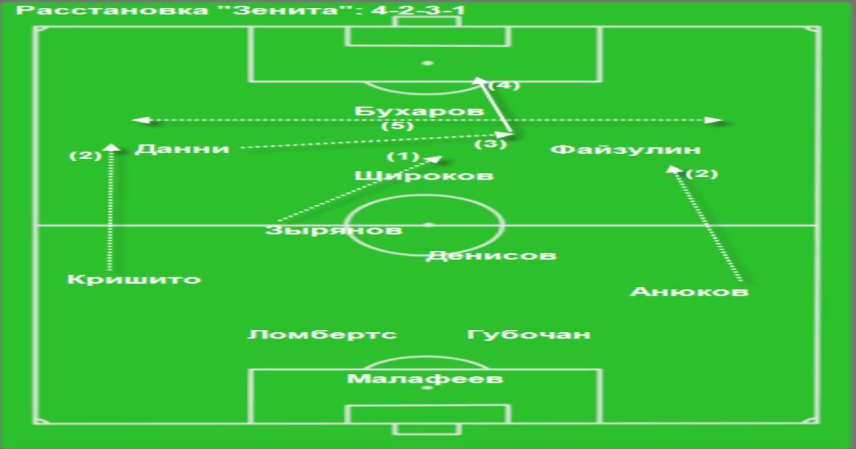 Как обычно, много двигался Данни. Несколько его смещений в зону правого фланга (3) привели к острым вертикальным атакам (4). Бухаров оттягивался на края поля, когда «Зенит» выходил из обороны (5). Ему часто адресовались длинные передачи из глубины, чтобы он цеплялся за мяч. Другим вариантом выхода из обороны у хозяев был средний пас в середине поля. Словом, стоит отметить одну яркую особенность-преимущество «Зенита» – команда комбинировала очень разнообразно, где на смену мелким и средним передачам приходили длинные диагонали, а игра низом сменялась игрой верхом. И переходы эти, что важно, происходили очень уместно и толково.