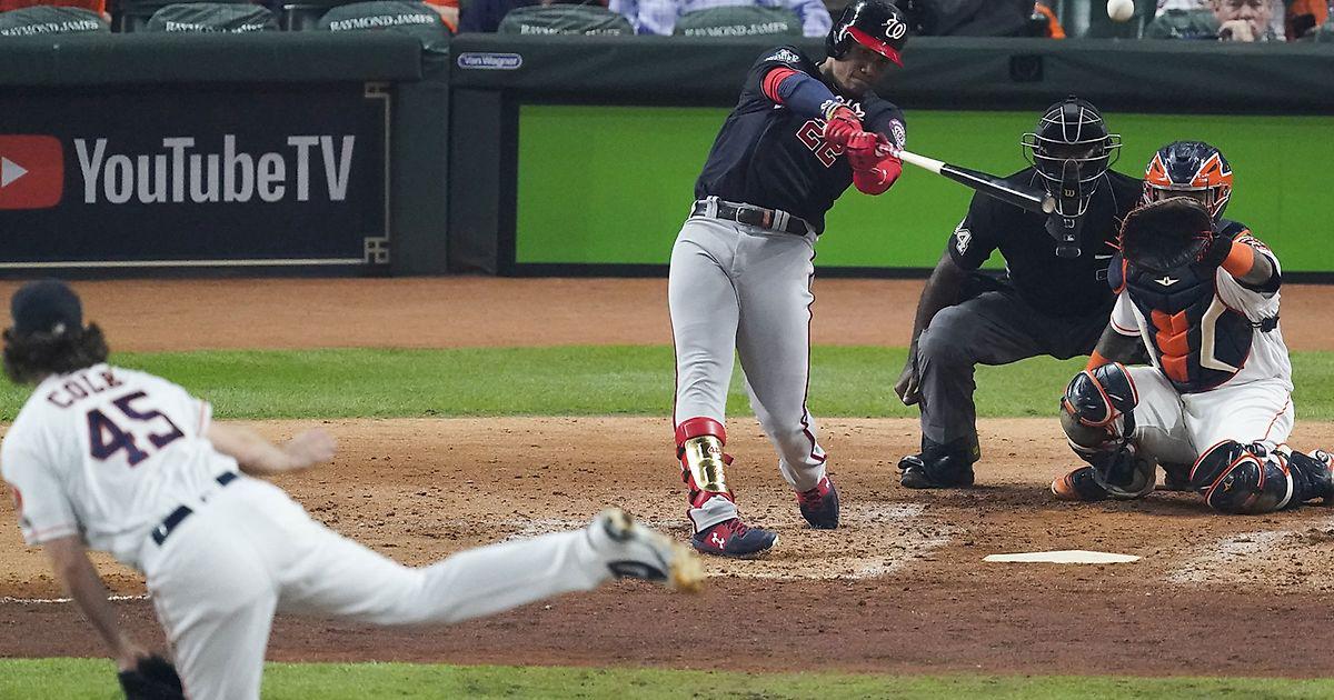 "Хьюстон Астрос"-"Вашингтон Нэшнлз" 4:5.В первом иннинге Юли Гурриэль выбил дабл (1),а Джордж Спарнгер и Хосе Алтуве вывели хозяев вперёд.Во втором иннинге Райан Циммерман выбил хоум-ран (1).В 4 иннинге Хуан Сото выбил хоум-ран (1).В 5 иннинге Адам Итон выбил сингл и Курт Сузуки вывел гостей вперёд.Затем Хуан Сото выбил дабл (1),а Виктор Роблес и Энтони Рендон увеличили отрыв гостей.В 7 иннинге Джордж Спрингер выбил хоум-ран (1).В 8 иннинге Джордж Спрингер выбил дабл (1) и Кайл Такер сократил разницу в счёте.Питчер гостей Марк Шерцер (3-0) сделал 7 страйк-аутов,заработал два гранд-аута и 4 флай-аута."Граждане" повели в серии 1-0.