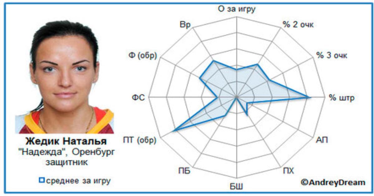 О - очки за игру. Здесь всё просто, по оси откладывается число очков набранных игроком за игру или среднее значение этого параметра за определенный период о чем будет пояснено в легенде графика. За максимум принято значение в 25 очков, редко игроки набирают больше, но если такое и случится, то на графике это будет заметно по более широким лепесткам выходящим за рамки диаграммы;