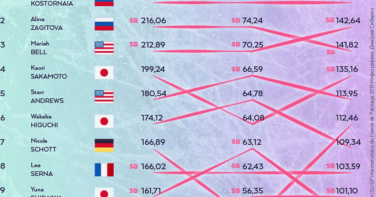 3 ноября 2019, 12:56 Гран-при Франции в цифрах: у Загитовой лучшие компоненты, Косторная – с самым дорогим элементом Этот пост написан пользователем Sports.ru, начать писать может каждый болельщик (сделать это можно здесь). Итоговые результаты, технические оценки, лучшие элементы, медальный зачет Гран-При Автор Dmitry Sibirin Этот пост опубликован в блоге на Трибуне Sports.ru. Присоединяйтесь к крупнейшему сообществу спортивных болельщиков! Другие посты блога Фигурное катание в инфографике Гран-при Франции Алена Косторная Мэрайя Белл Мария Сотскова Алина Загитова