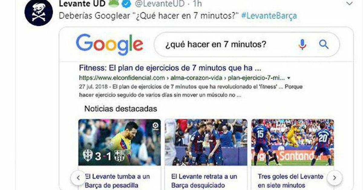"Леванте" очень круто потроллил каталонцев. "Лягушки" разместили на своей страничке в Twitter картинку поисковика с вбитым запросом: "Что можно сделать за 7 минут?". В ответ показан обзор игры "Леванте" и "Барселоны".
