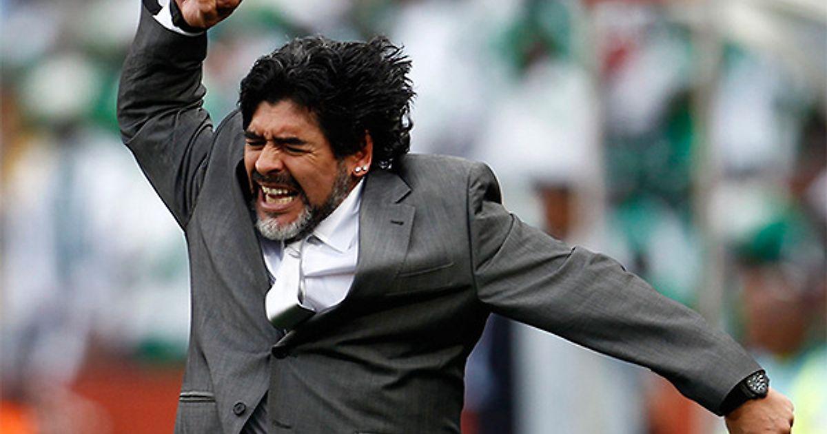 В "Дорадосе", с которым Марадона не погнушался работать во втором по силе дивизионе, он тоже надолго не задержался. А в начале сентября этого года возглавил на родине худший на тот момент клуб чемпионата «Химнасию», где устроил шоу после первой же победы. Короче, шоумен и гастролер из Марадоны первоклассный! Тренер никакой… Тем не менее однажды ему доверили сборную родной страны! Аргентина посредственно отыграла отбор к мундиалю-2010, даже залетела Боливии 1:6, но смогла ухватиться за последнюю прямую путевку (4 место).